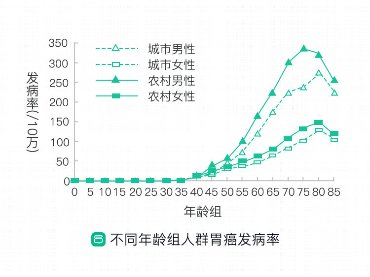 胃癌的高发年龄在50-80周岁,近年来,胃癌发病呈年轻化趋势,而年轻人尤以恶性程度高的胃癌居多,所以预防胃癌很重要。 对于一级亲属中有. 胃癌的发病率随年龄的增长而升高。25 岁之前各个年龄组胃癌发生率均低于 1/10 万,从 55 岁开始发病率超过 50/10 万,至 80~84 岁达到高峰,为 185. 85/10 万; 从 40~44 岁组开始,男性胃癌发病率显著高于女性,尤其在 55~64 岁组,男性发病率约是女性的 2 倍。 不. 癌症发病率和死亡率存在明显的年龄、性别和地域差异. 2015年我国癌症发病情况. 基本情况. 新发病例 392. 9万. 年龄标准化发病率 186. 39/10万. 男性高于女性 ( 206. 49/10万 vs. 168. 45/10万) 发病前十位. 性别差异. 年龄差异. 0-19岁 与 50-85岁 :男性高于女性. 20-49岁.